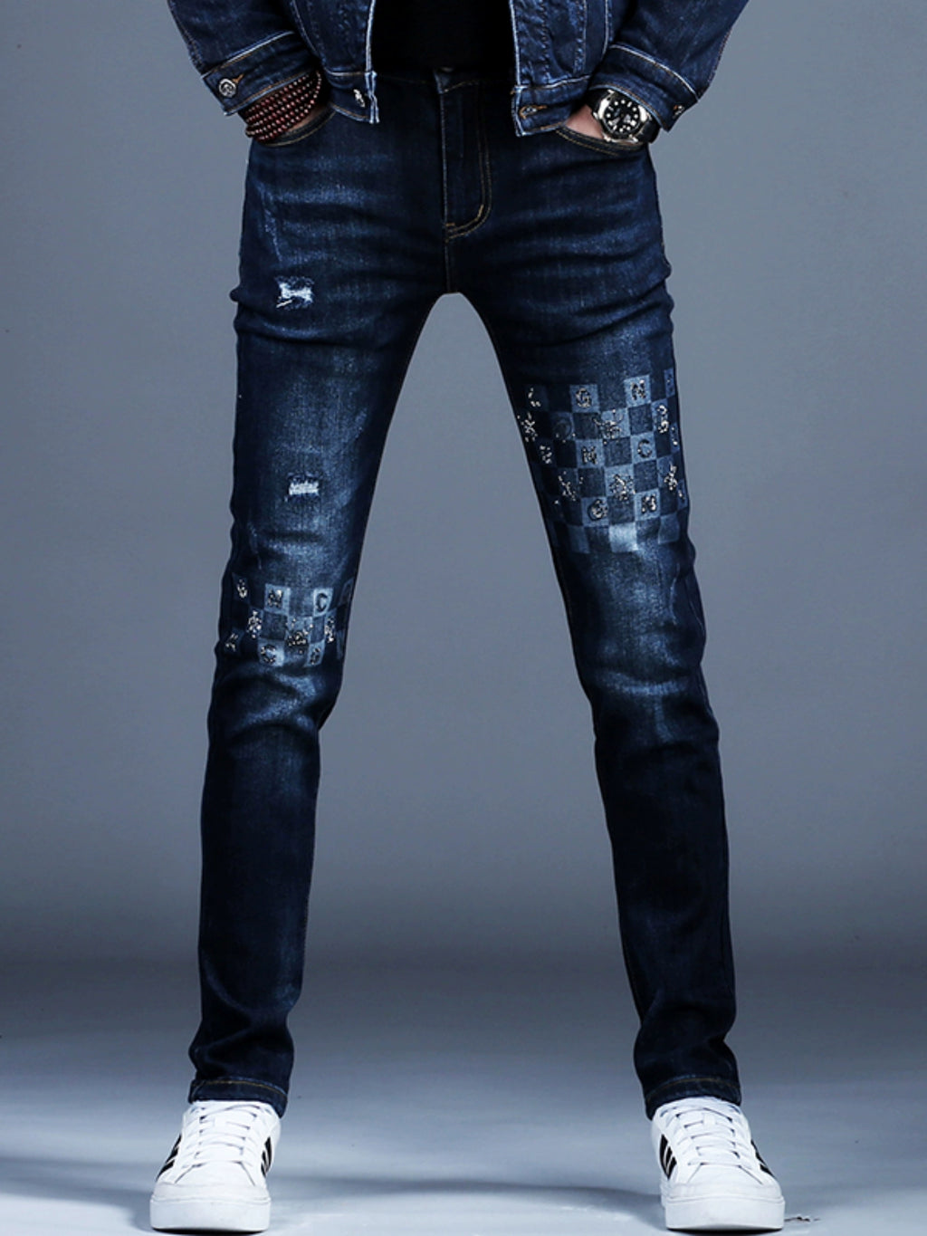 Conception : Immeuble de moyenne hauteur, fermeture éclair, imprimé lettre, poches multiples, effet vieilli, coupe tridimensionnelle, strass tendance